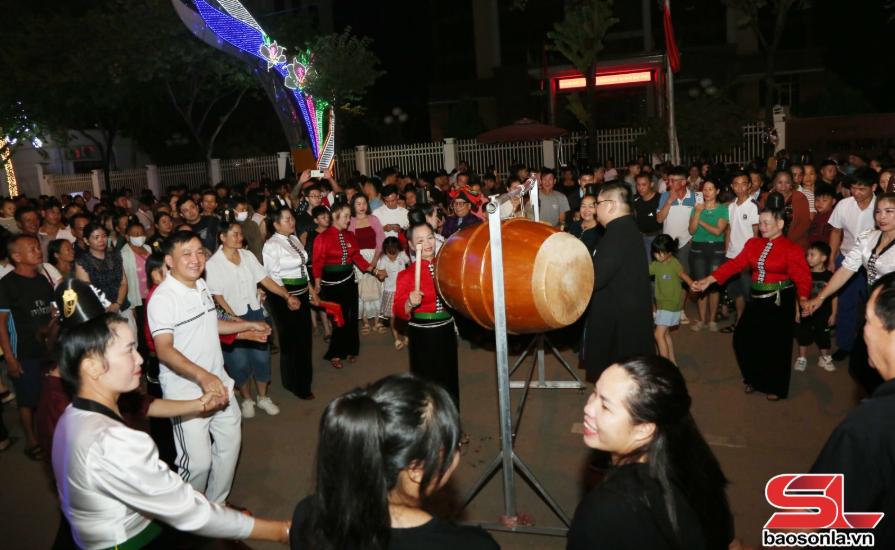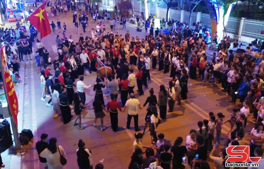 Đông đảo nhân dân, du khách tham quan, trải nghiệm vòng xòe tại phố đi bộ Hoàng Quốc Việt, phường Chiềng Cơi.