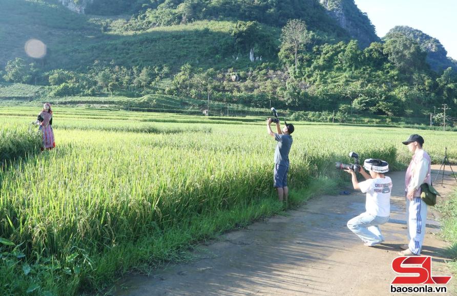 Du khách chụp ảnh tại đồng lúa chín bản Hùn, phường Chiềng Cơi.