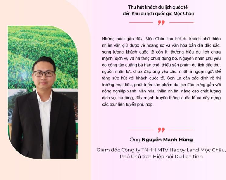 Phát biểu khai mạc và đề dẫn hội thảo, đồng chí Hà Trung Chiến nhấn mạnh: Với cảnh quan hùng vĩ, khí hậu trong lành và bản sắc văn hóa đặc sắc, Khu du lịch quốc gia Mộc Châu lần thứ ba được vinh danh “Điểm đến thiên nhiên hàng đầu thế giới năm 2025”, khẳng định vị thế du lịch Mộc Châu và Sơn La trên bản đồ du lịch trong nước, quốc tế. Nghị quyết Đại hội Đảng bộ tỉnh lần thứ XVI xác định du lịch là ngành kinh tế mũi nhọn, phát triển Mộc Châu theo hướng xanh, bền vững; tỉnh Sơn La mong muốn các chuyên gia, doanh nghiệp đóng góp ý kiến, đề xuất giải pháp nâng cao chất lượng sản phẩm, dịch vụ, xây dựng thương hiệu du lịch Mộc Châu phát triển bền vững...