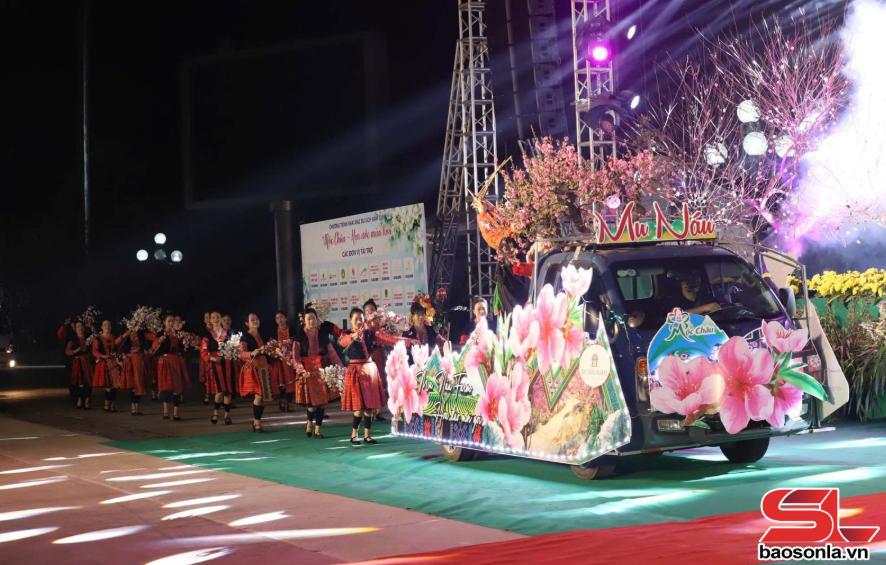 Màn diễu hành xe hoa đường phố tại đêm khai mạc Chương trình du lịch năm 2026 với chủ đề "Mộc Châu - Hẹn ước mùa hoa".