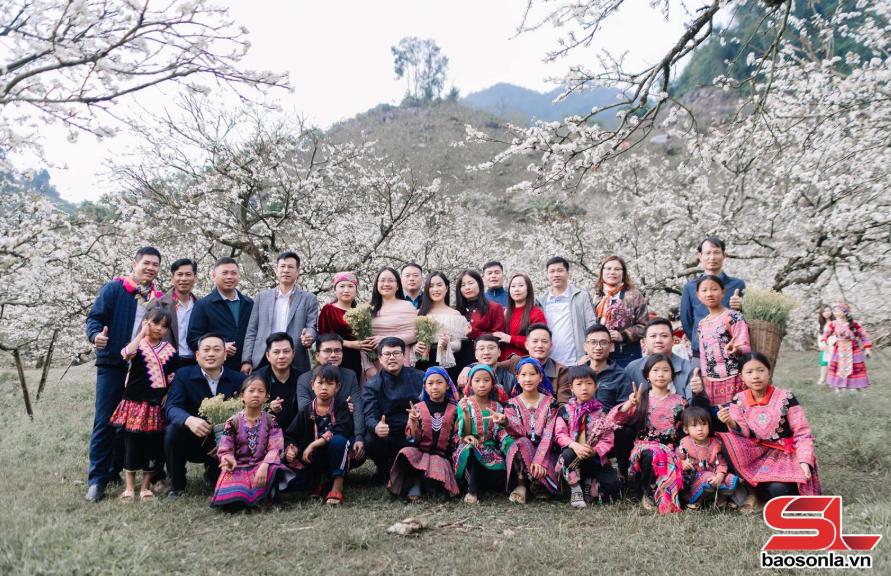 Du khách chụp ảnh tại vườn hoa mận, phường Thảo Nguyên.
