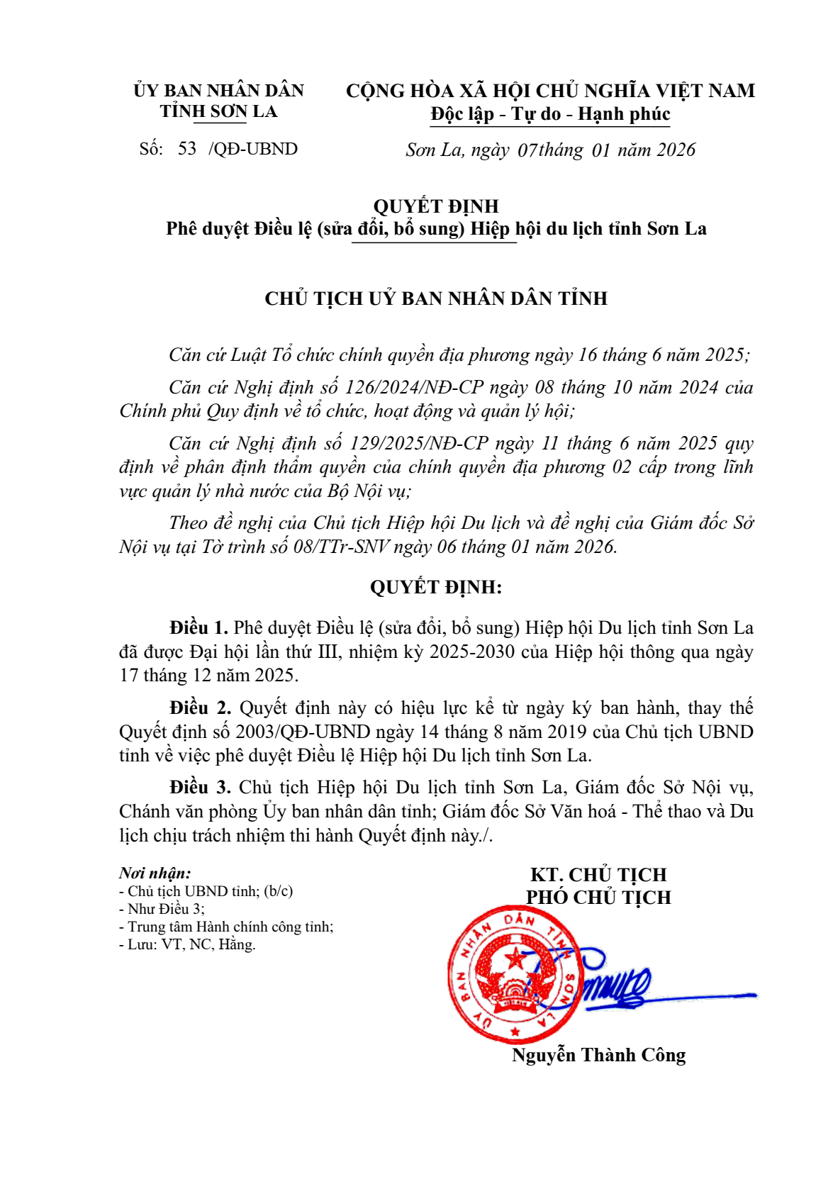 1. Điều lệ Hiệp hội Du lịch tỉnh Sơn La gồm 08 Chương 28 Điều đã được Đại hội Đại biểu Hiệp hội Du lịch tỉnh lần thứ III, nhiệm kỳ 2025 - 2030, thông qua ngày 17 tháng 12 năm 2025 và có hiệu lực thi hành theo Quyết định phê duyệt của Chủ tịch Uỷ ban nhân dân tỉnh Sơn La.